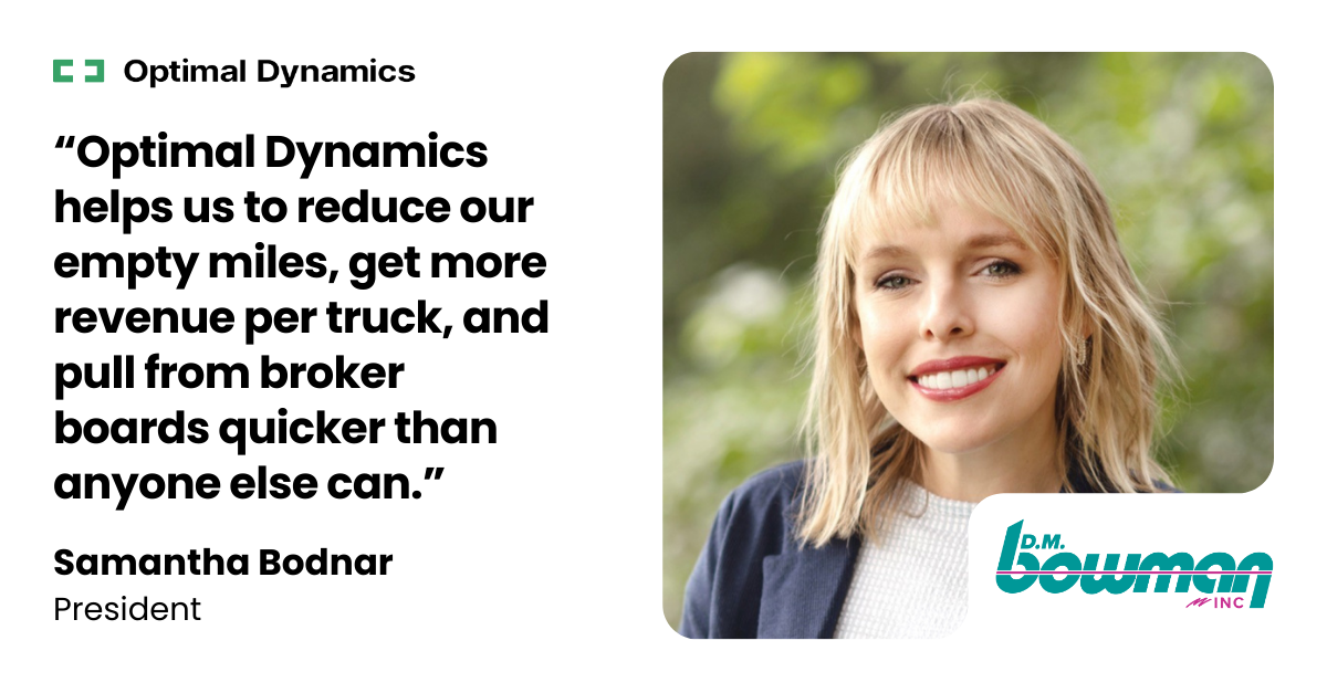 Samantha Bodnar of D.M. Bowman shared that the average age of the company’s leadership team has dropped by more than a decade — not by design, but because a values-driven culture attracted younger leaders naturally. Samantha was recently recognized as an HDT Emerging Leader for how she’s successfully disrupting the company’s traditional operations by adopting AI-driven load planning and dispatching optimization software from Optimal Dynamics. As she stated, “Optimal Dynamics helps us to reduce our empty miles, get more revenue per truck, and pull from broker boards quicker than anyone else can."