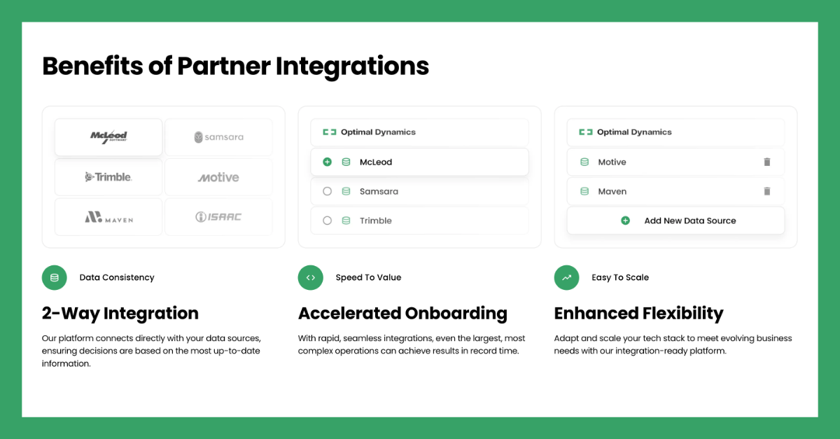 At Optimal Dynamics, we offer a number of TMS integrations, including connections to McLeod, Trimble’s TMW.Suite, TruckMate, PCS Software, SSI PowerPRO, and other platforms, helping you automate decisions and improve efficiency across your processes and workflows. Through integrations with these platforms, Optimal Dynamics allows trucking companies to make optimized, real-time decisions around load planning, dispatching, and request for proposal (RFP) responses. Adding Optimal Dynamics to your TMS ultimately leads to improved asset utilization and profitability.
